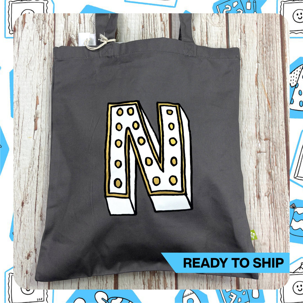 This is our lovely strong organic cotton tote. The letter N is made up of a layer of black flock on a shiny gold layer. Ex-stall stock