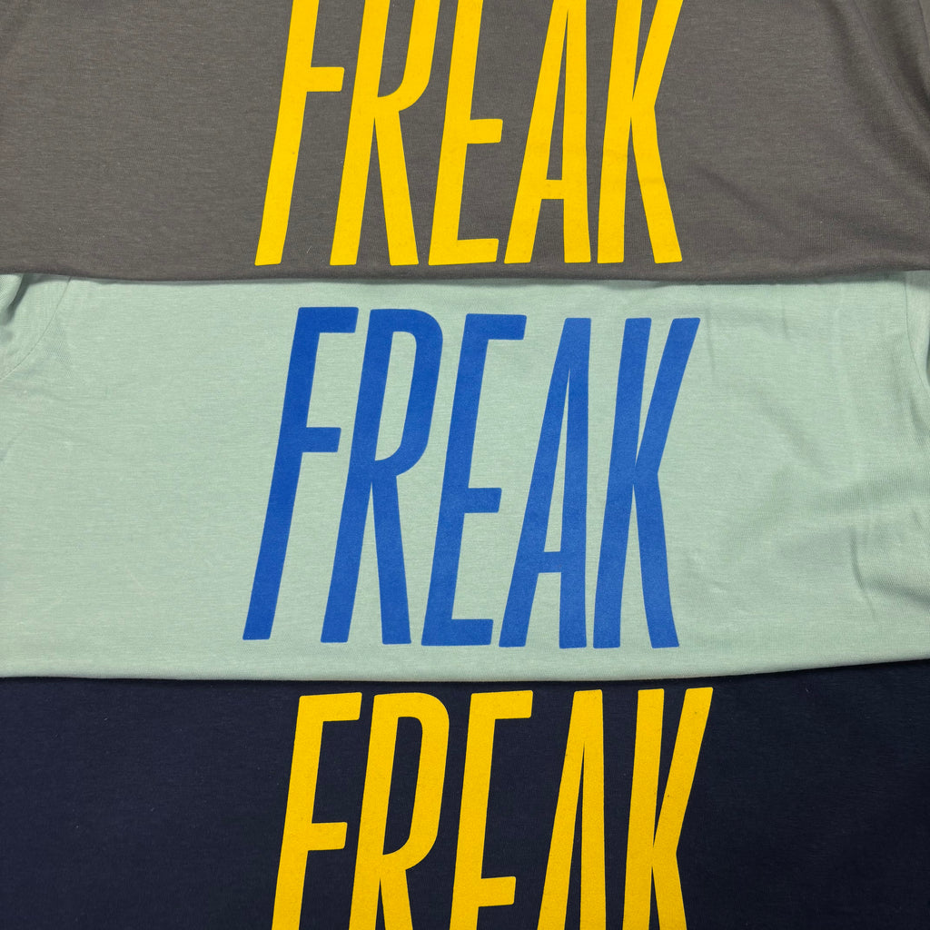 Be proud freaks of the world! Wear in your choice of coloured shirts with contrasting flocked text. Available in 8 colours and sizes from Small to 2XL, in both unisex and women’s cuts. The Mustard yellow, dusty green, forest green and rust are organic cotton. The women's shirts are form-fitted with a slightly lowered flattering neckline and are organic cotton.